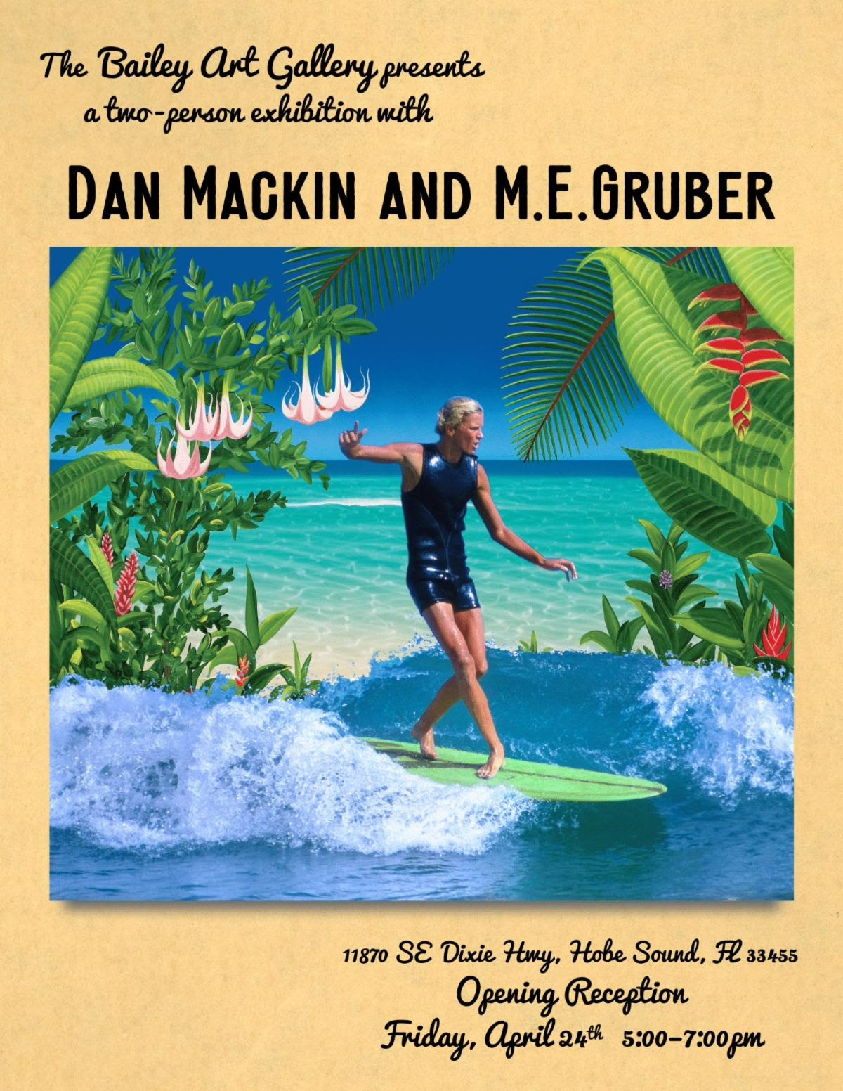 The Bailey Art Gallery is pleased to present a two-person exhibition featuring local painter Dan Mackin, whose highly stylized work spans multiple mediums, and photographer M.E. Gruber, who documented the burgeoning surf scene in Palm Beach County and the Treasure Coast in the 1960s and early 70s. The exhibition opens Friday April 24, 2026 and runs through the summer. Mackin and Gruber share some commonalities. They both express their love for a life on the water, conveying it with a sense of color that is vibrant; seemingly technicolor in feel. They also both served in the US Navy – Gruber in World War II and the Korean War, Mackin in Vietnam.