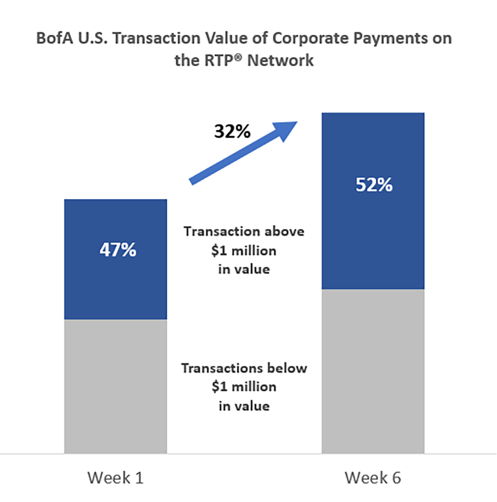 In the first six weeks since the transaction limit was raised, BofA corporate clients have increasingly taken advantage of the limit increase, with transactions over $1 million now accounting for more than half the value of all U.S. real-time payments the company is processing.