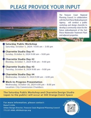 The Treasure Coast Regional Planning Council, in partnership with the Fort Pierce Redevelopment Agency (FPRA), invites the community to participate in a public workshop to kick off the Western Peninsula Charrette on Saturday, October 5, 2024, at the 500 Orange Event Center starting at 10 AM.