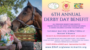All proceeds from the 6th Annual Derby Day Benefit support the programs and services of Martin County 501(c)(3) nonprofits Equine Rescue and Adoption Foundation (ERAF) and Caring Children Clothing Children (4Cs.) For more information about ERAF visit www.ERAF.org or follow them on social media at @ERAFHorseRescue. For more information about 4Cs visit www.4CMartin.org or follow them on social media @4csClub.