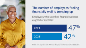 Today, 47% of American workers feel financially well, up from 42% at this time last year. This is according to Bank of America’s 14th annual Workplace Benefits Report, “The Resurging Workforce.” Conducted in partnership with Bank of America Institute, the report also found that 53% of employees are concerned that economic uncertainty will affect their long-term retirement savings, down from 63% in 2023.
