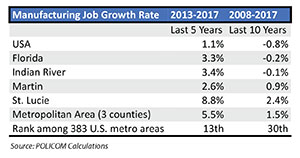POLICOM each year ranks U.S. metropolitan areas on economic strength and the long-term likelihood that they grow in economic size and quality. By POLICOM calculations, growth in the number of manufacturing jobs on the Treasure Coast in the last five years has outpaced 97 percent of the 383 U.S. metro areas studied. And in the past 10 years, the Treasure Coast ranks 30th of those metro areas for growth of manufacturing employment.