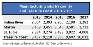 Manufacturing employment accounts for only 3.6 percent of the total workforce on the Treasure Coast, but the sector’s rapid growth encourages economic development leaders in all three counties.