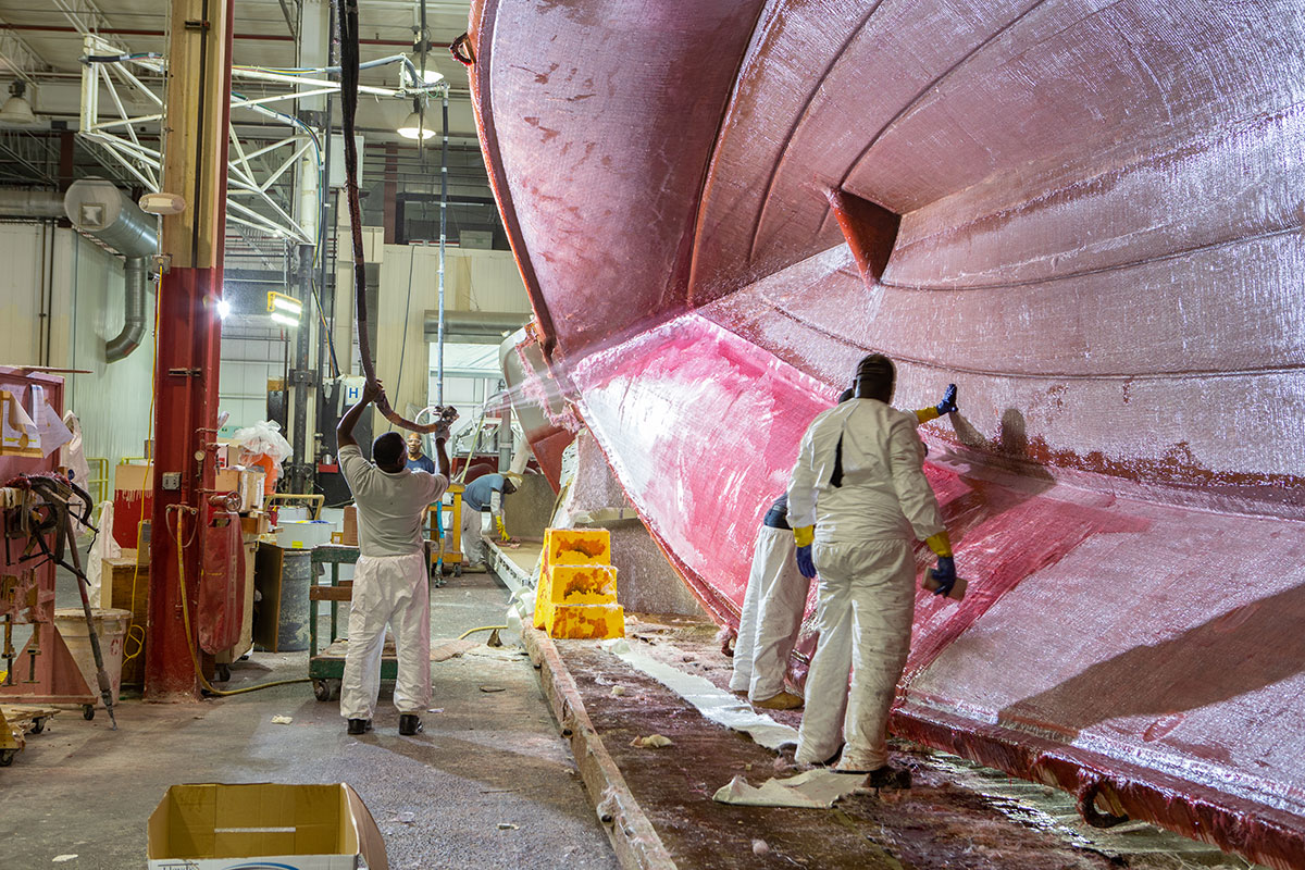 Just like at Piper and Triumph, there is no conveyer-belt type assembly line at Pursuit. Workers who specialize in different parts of construction in progress move boats along on dollies to work stations from molds for hulls to fiberglass to paint shop areas in Pursuit’s 250,000 square feet of manufacturing space.
