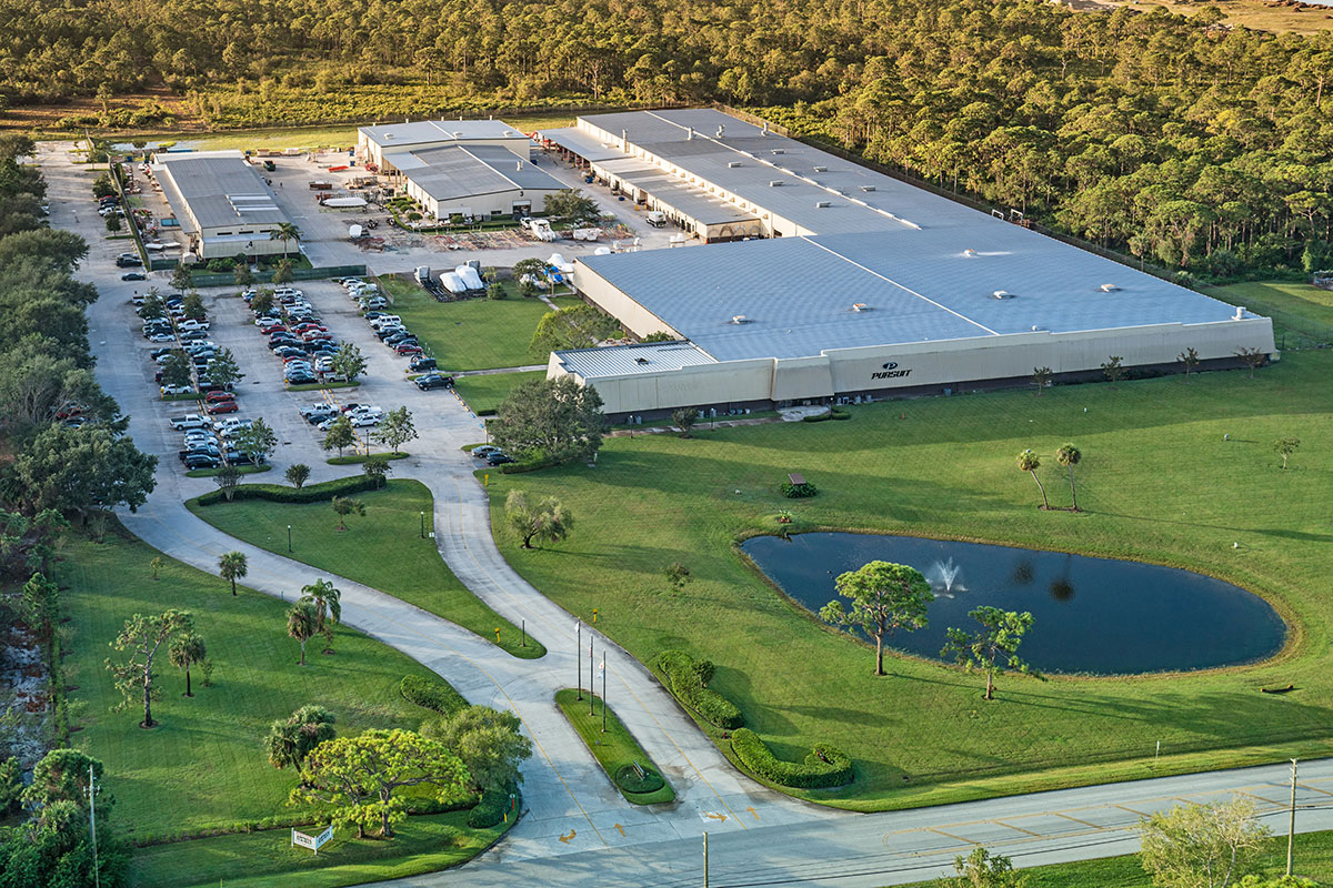 An aerial photo of the factory in Fort Pierce for Pursuit Boats, which makes high-end fishing boats. PURSUIT BOATS