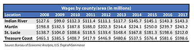 Average manufacturing wages, which include money paid into retirement funds as well as manager and blue-collar worker pay, in 2017 were $65,364 in Martin County; $62,810 in Indian River; and $52,906 in St. Lucie. Starting from the previous 10 years, Martin showed an average wage gain of 17 percent; Indian River, 25 percent; and St. Lucie, 14 percent. These figures are higher than what many people think of as an annual worker salary. Figures for production workers are in the low- to mid-$40,000s annually, local economic development officials say.